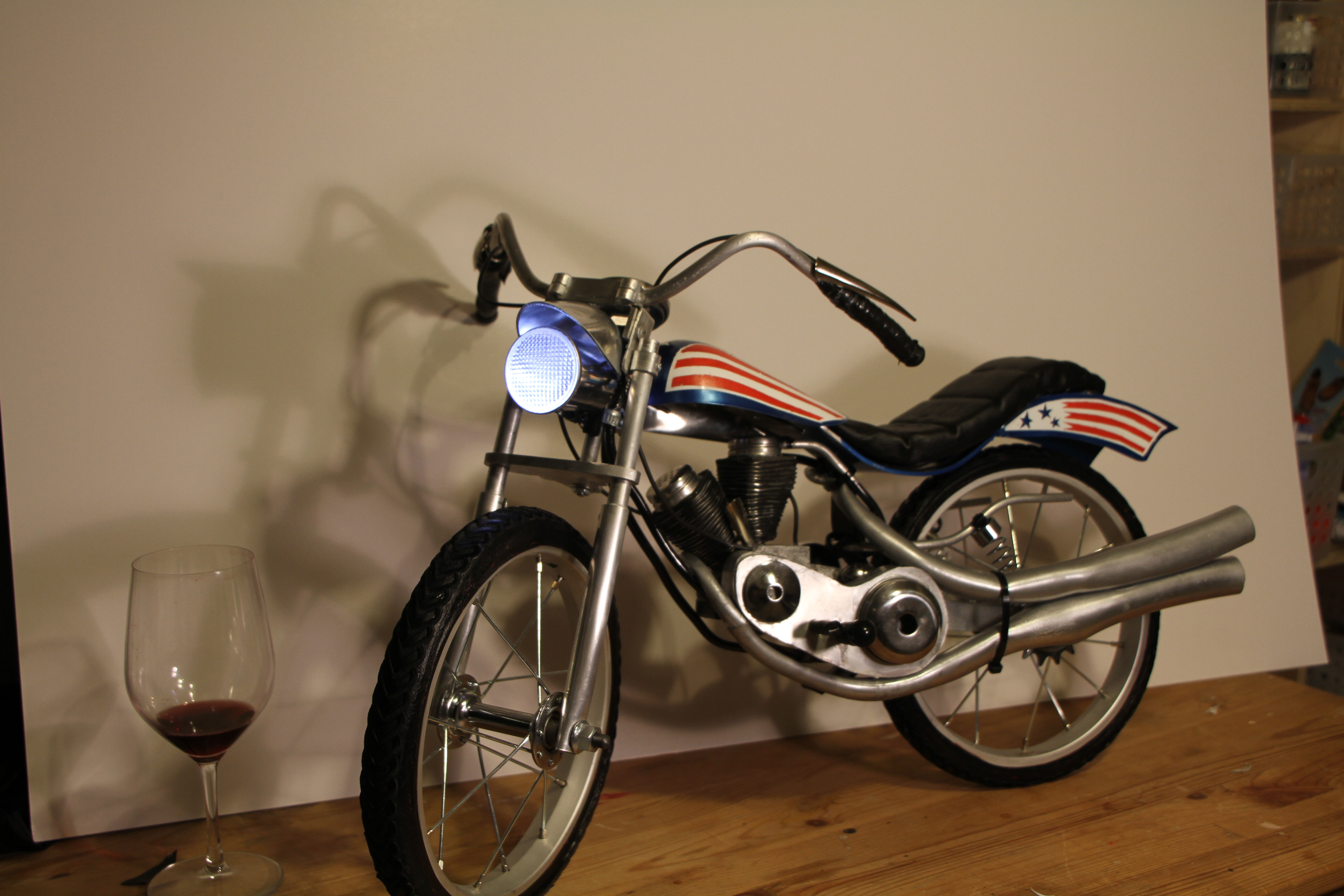 This is a motorbike is a replica of Evil Knievel's bike, which I created for the 2016 Worlds Greatest Shave Commercial. It is intended to be worn on top of somebody's head. The footage is then flipped to make it look like the Chin Character is riding the motorbike.